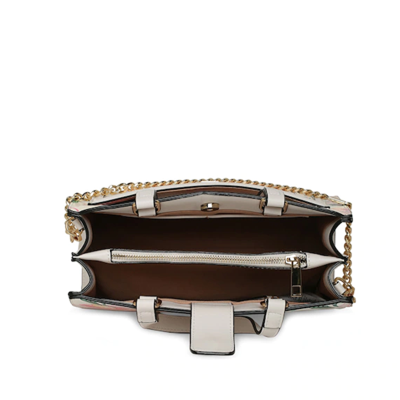 Pink floral printed handheld bag, with quilted detail 2 main compartments, has a zip closure, 1 inner pockets Tablet sleeve: no With a detachable sling strap